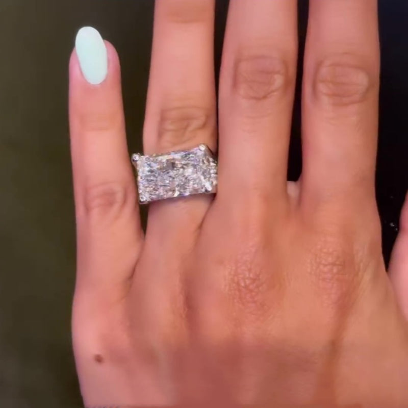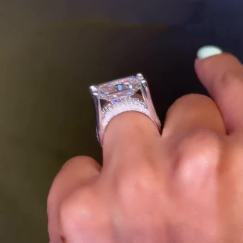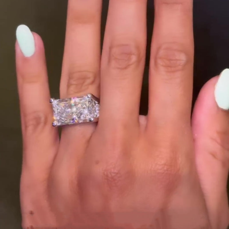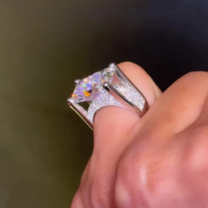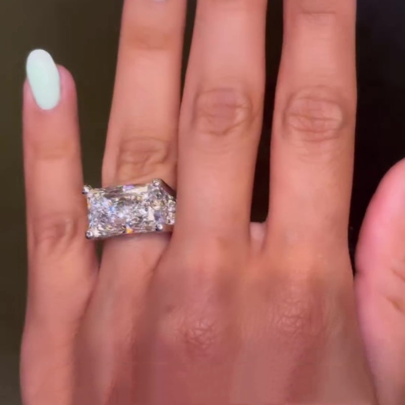 This exquisite 10-carat radiant cut silver ring epitomizes chic elegance. The radiant cut gemstone, renowned for its exceptional brilliance and modern allure, is meticulously set in a sleek silver band that enhances its dazzling sparkle. The ring's sophisticated design seamlessly blends contemporary style with timeless luxury, making it a perfect statement piece for any occasion. Its clean lines and polished finish add a touch of refined sophistication, making this radiant cut silver ring a stunning accessory that exudes both glamour and grace.