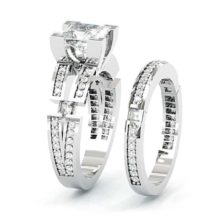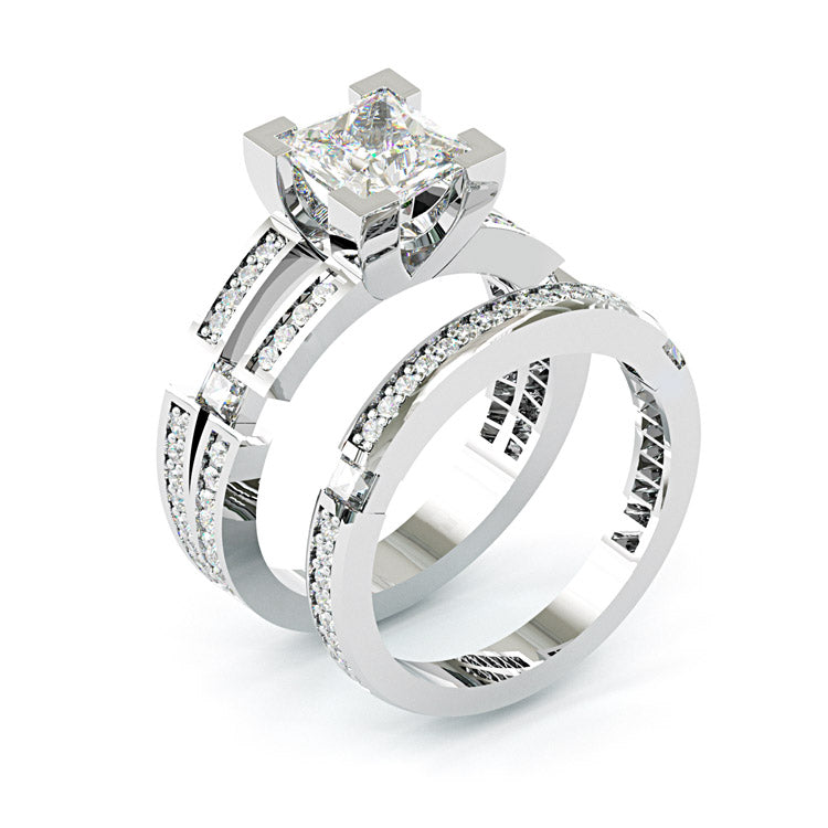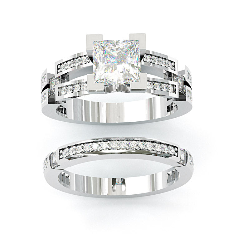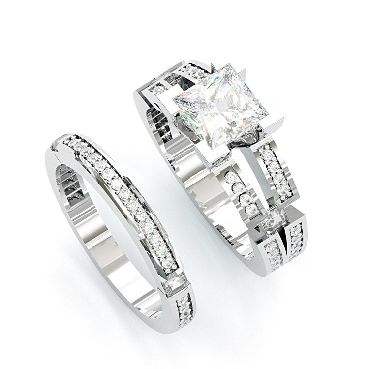 Stunning Centerpiece: Features a brilliant princess-cut diamond at the center, surrounded by sleek, geometric band designs.