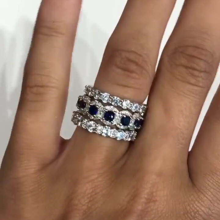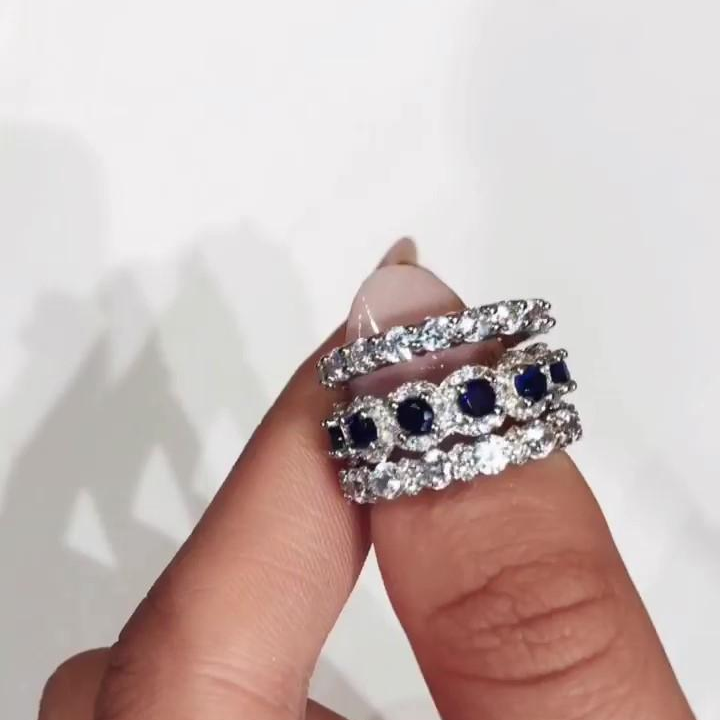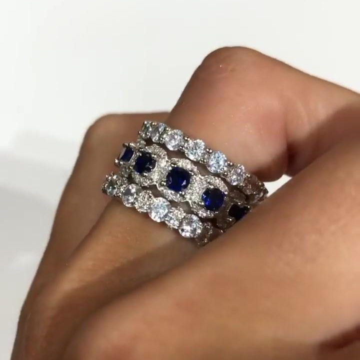 Jzora handmade 3 pcs round sapphire sterling silver eternity wedding band