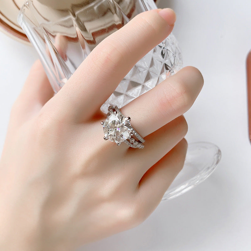 Style: Combines timeless elegance (solitaire-inspired center) with modern luxury (pavé detailing). The split shank adds structural stability while enhancing the ring’s overall brilliance.