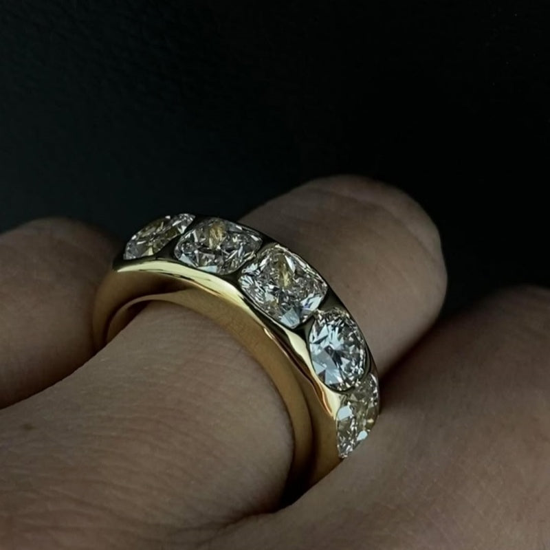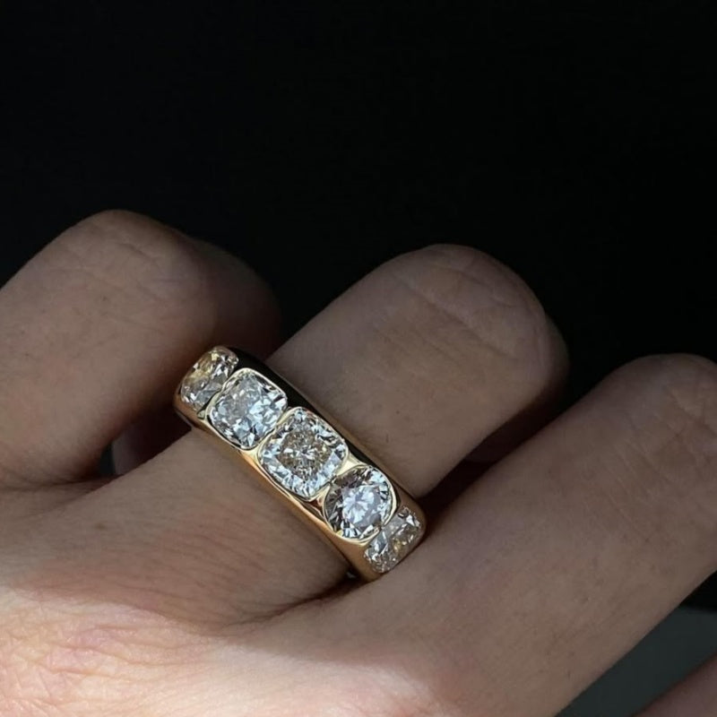 Mixed Diamond Shapes: Combines round brilliant and cushion cuts for a modern, eye-catching aesthetic with extra dimension.