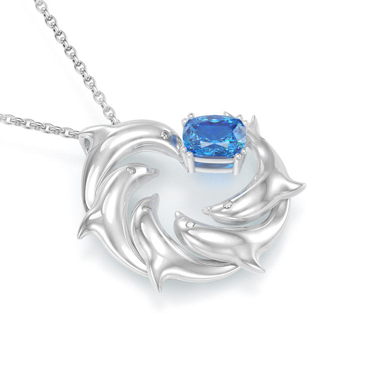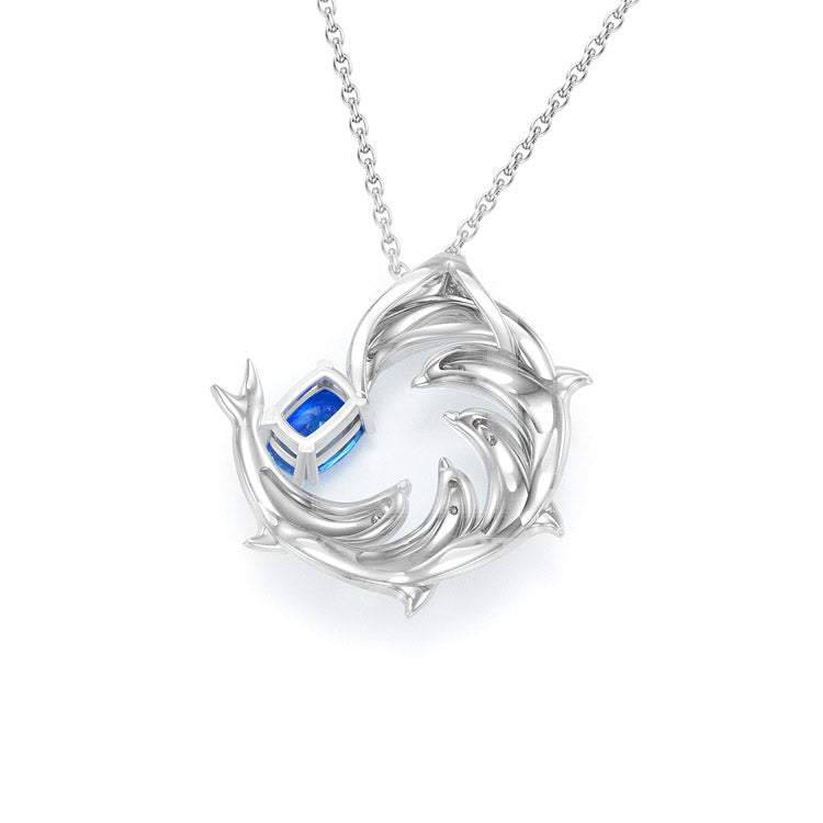 Jzora Handmade Dolphin Aqua Blue Cushion Cut Sterling Silver Diamond Necklace
