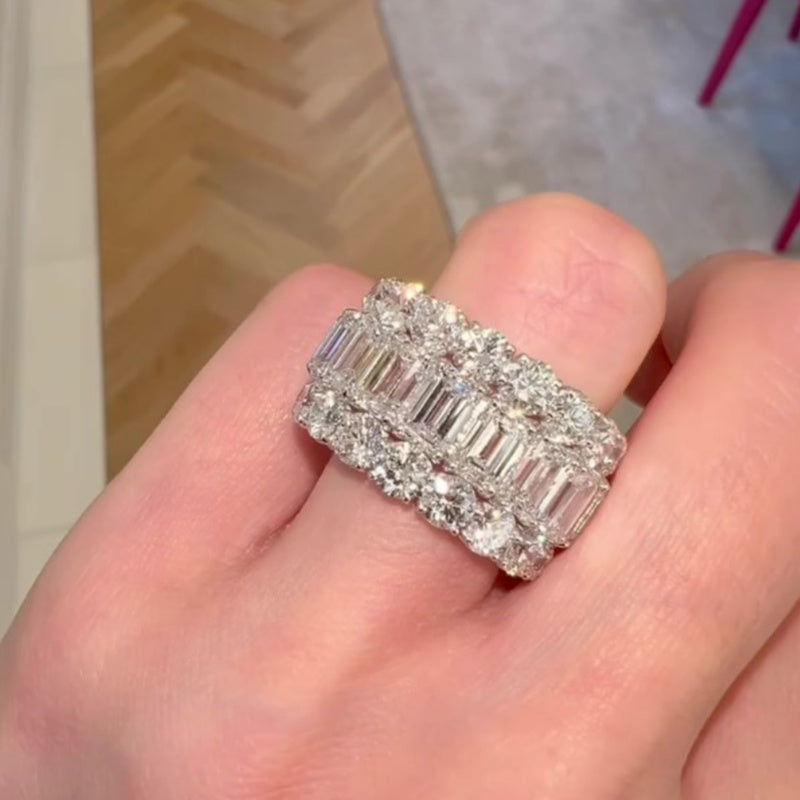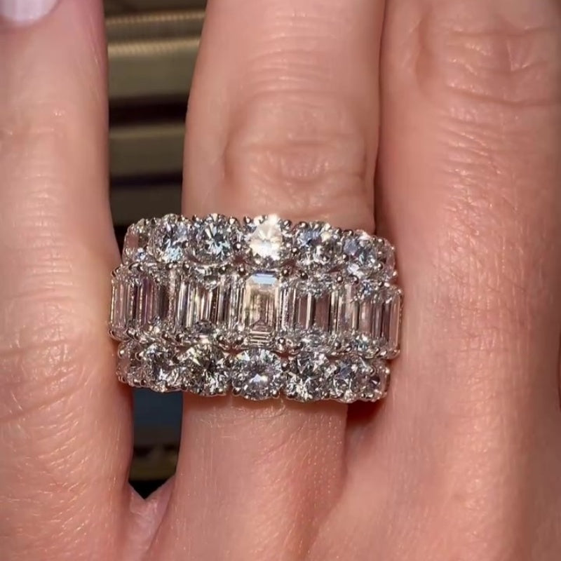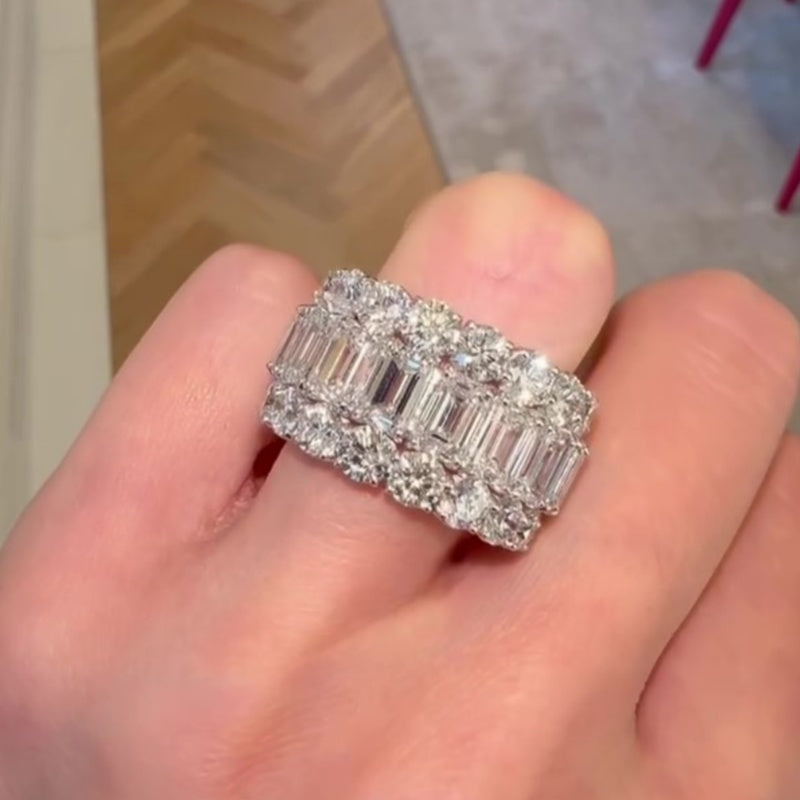 Jzora handmade luxury emerald & round cut double row full eternity women's wide band ring