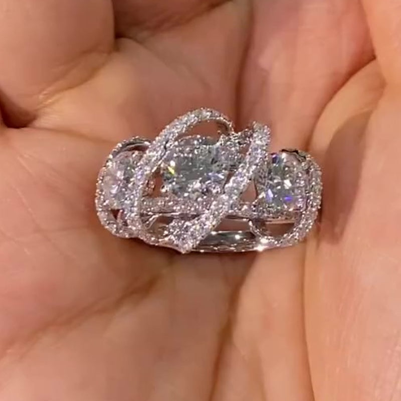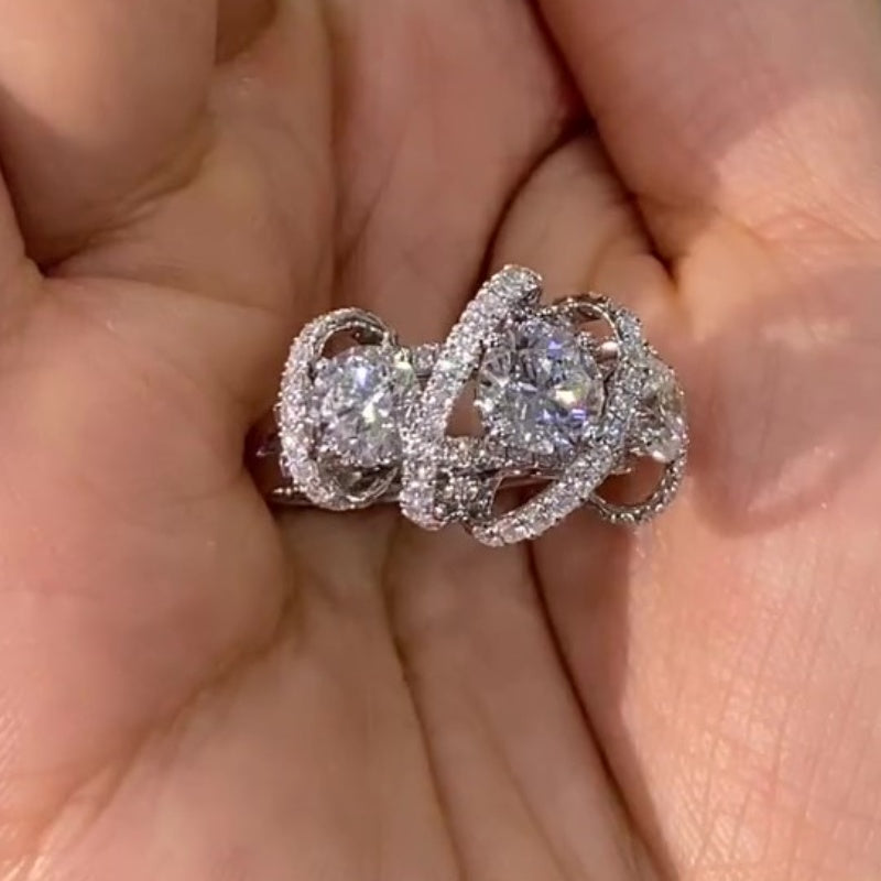 Jzora handmade round cut triple-stone crisscross pavé halo sterling silver ring