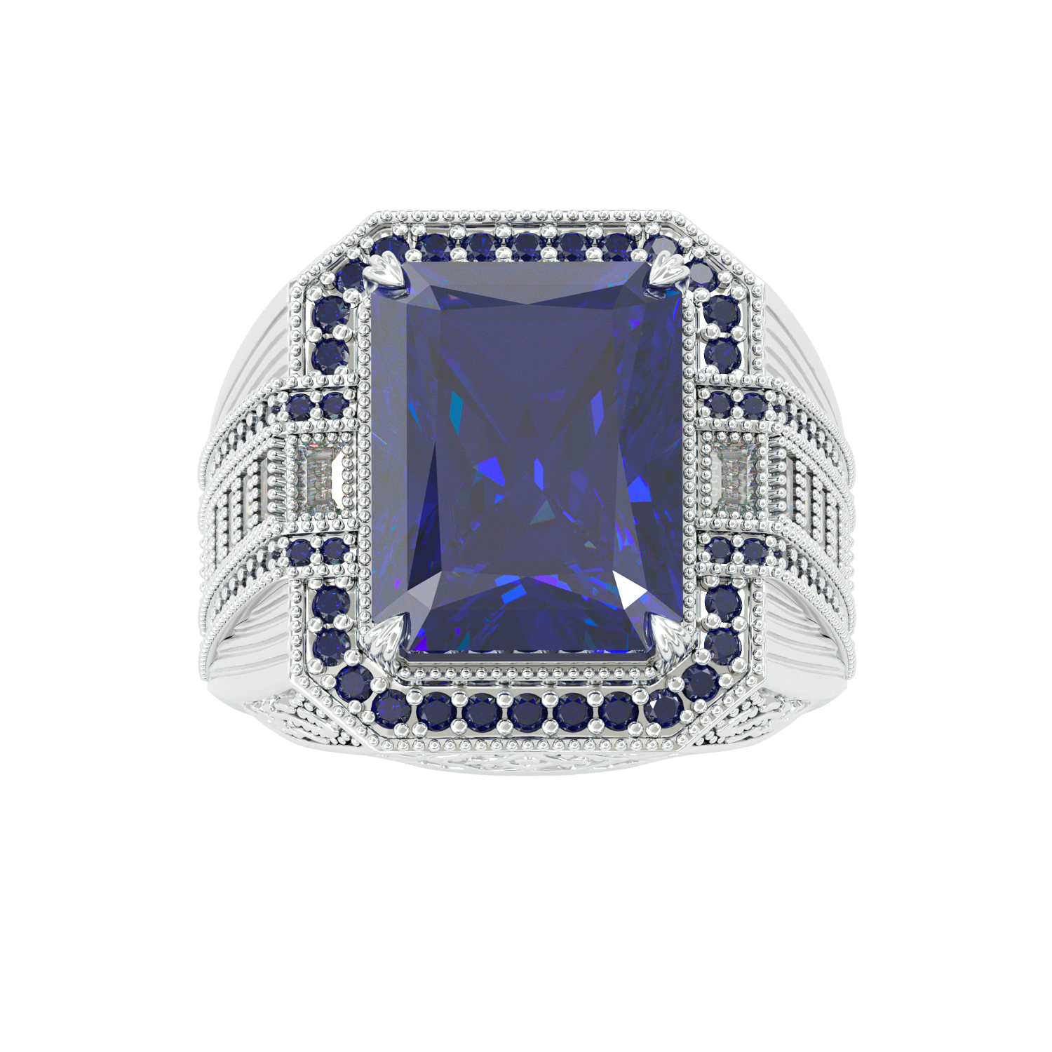 Striking Center Stone – Large radiant-cut deep blue sapphire-colored CZ with brilliant fire.